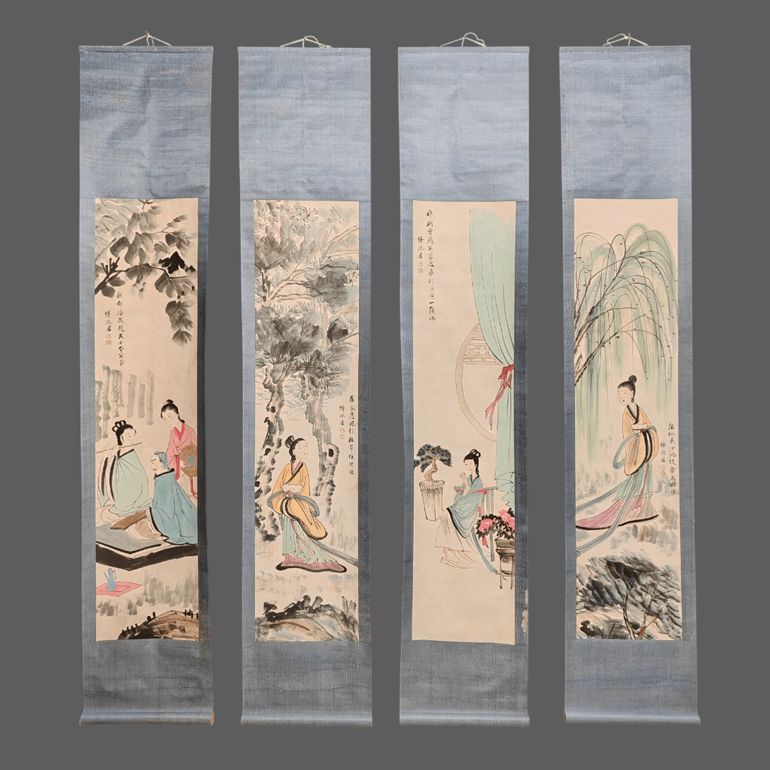 此組承襲抱石「風雨皴法」絕藝,人物飄逸若《九歌圖》宣紙蘊霧生籀,衣袂翻飛參顧愷之《洛神》筆意而創現代水墨新境。 特制皮紙曆七礬九染秘制,礦墨凝霜暗合《往往醉後》「蒼茫渾厚」道樞。 摹制工藝臻「風骨研習級」苛准,每屏皆經三紀酒禪淬墨。 較尋常人物摹本尤見六朝唐宋淵源,非止形神兼備,實乃融通浪漫詩情與時代筆墨的博物館級紙魂,當世可窺《湘夫人》脈絡的金陵真諦。
