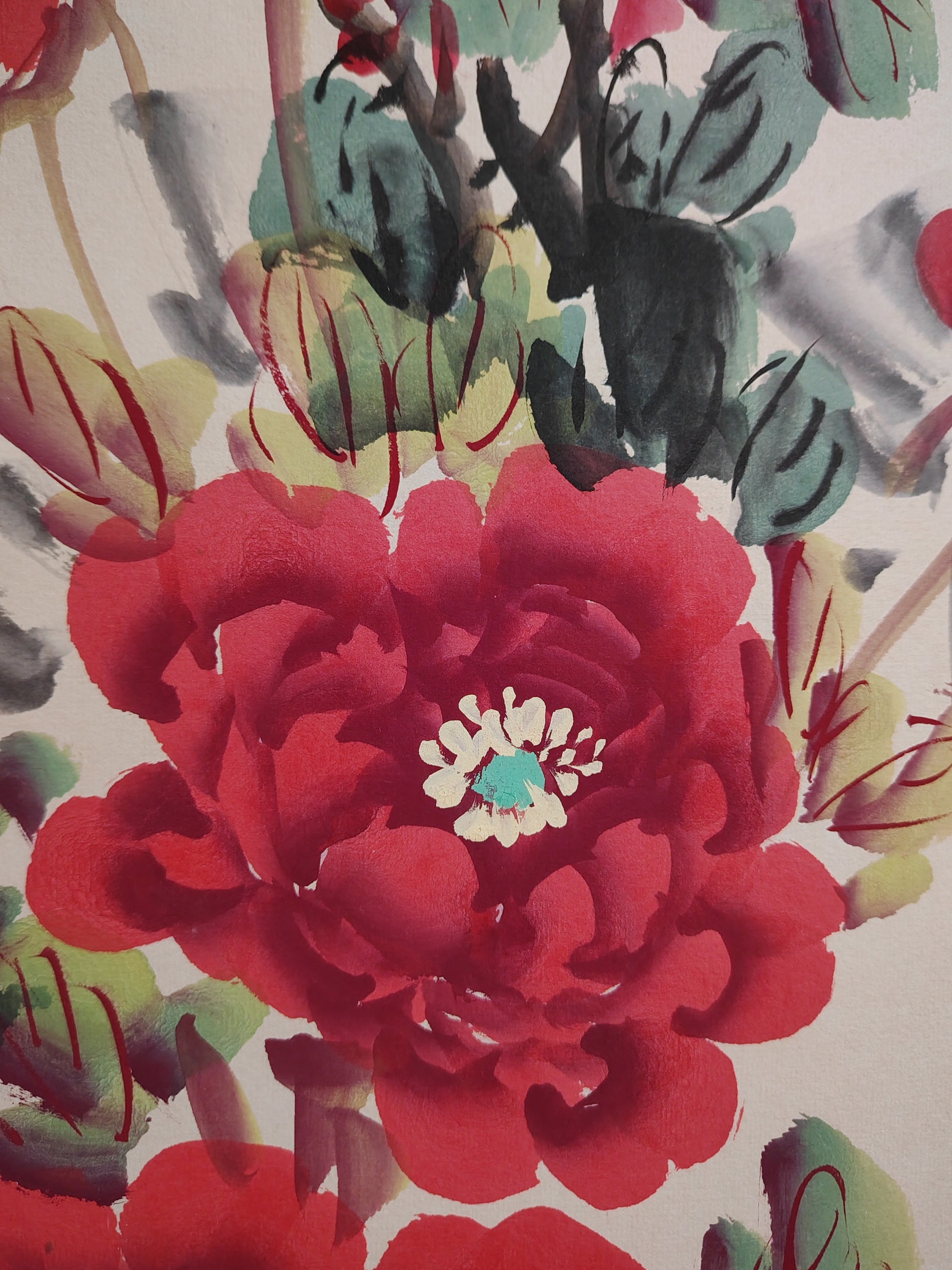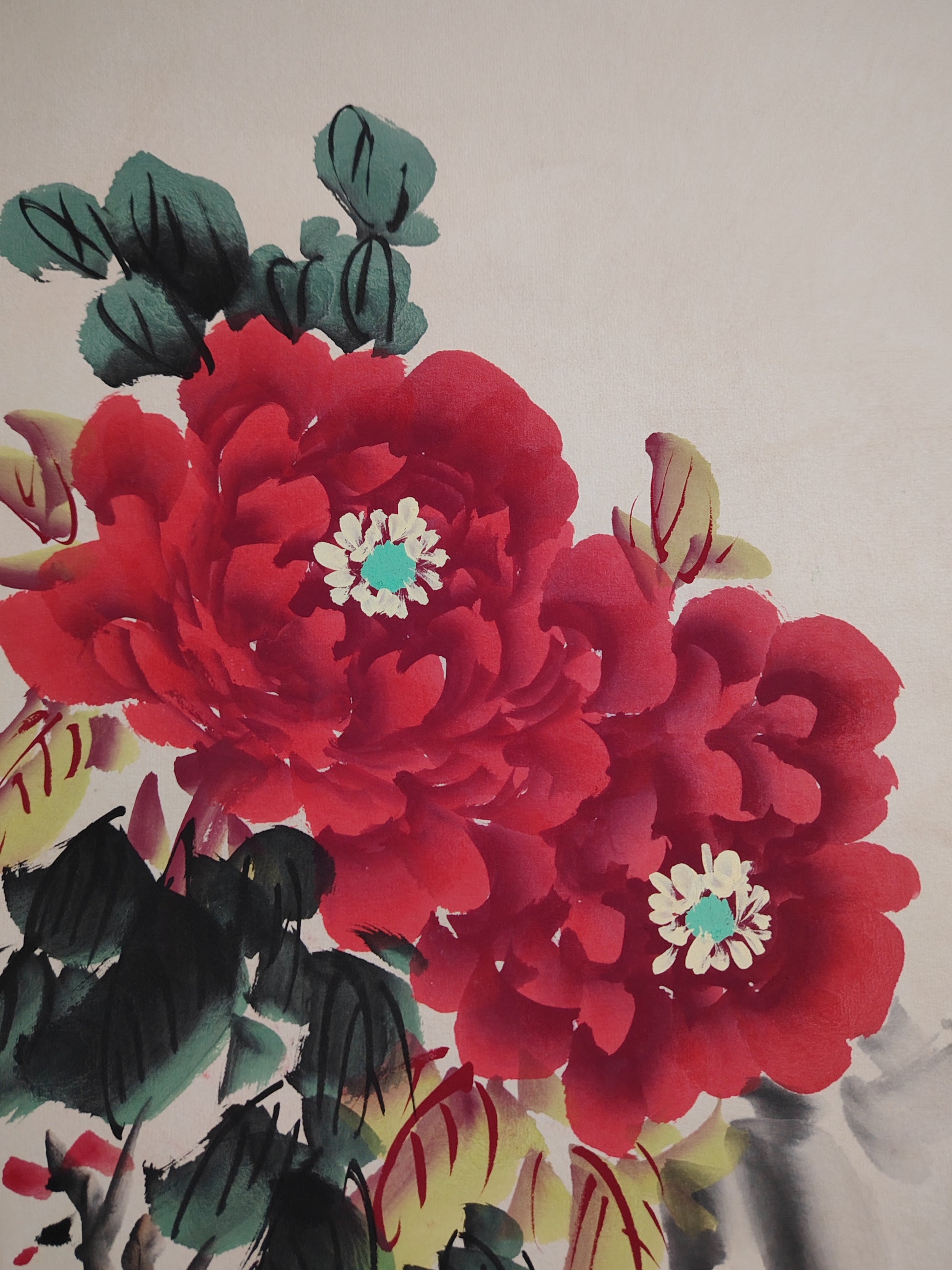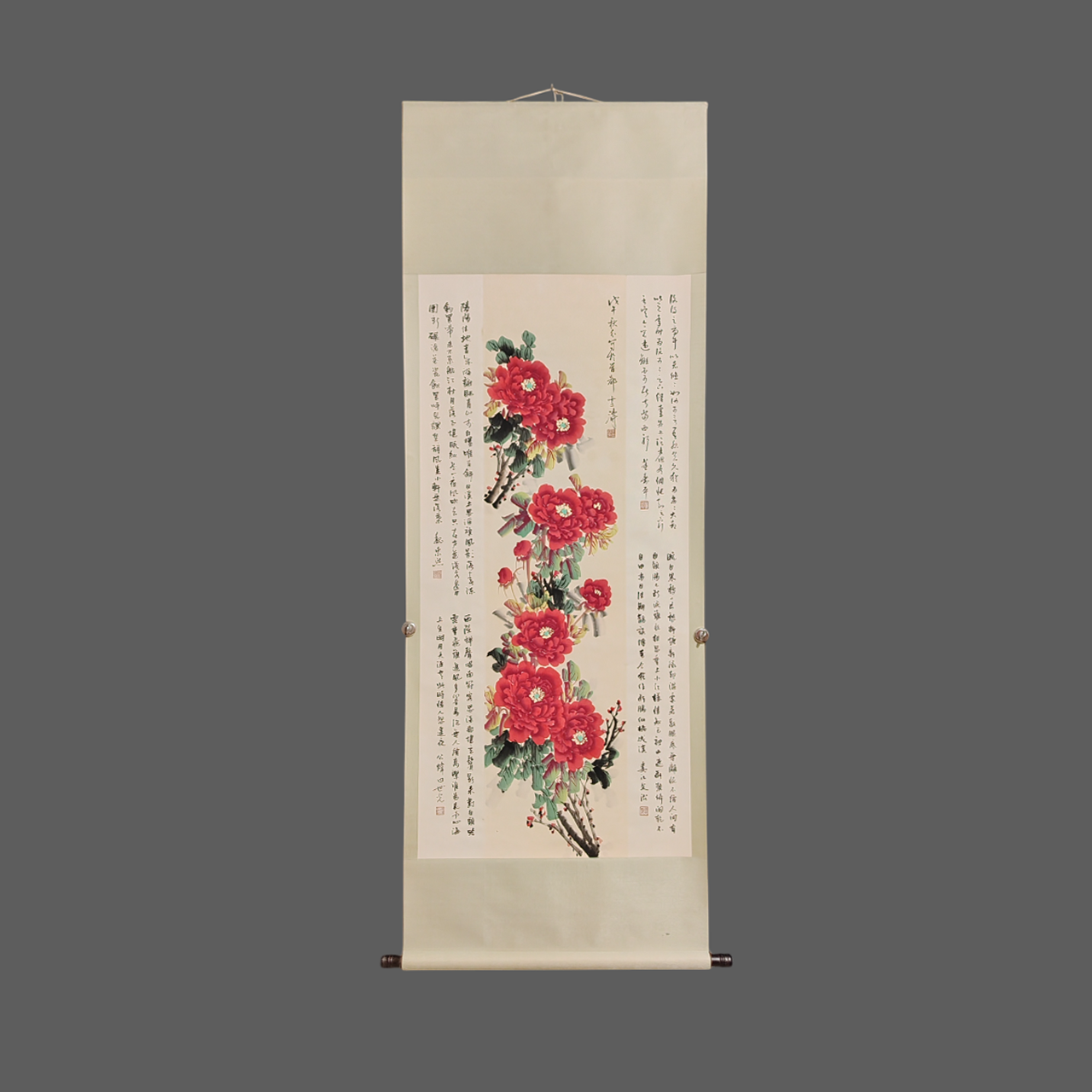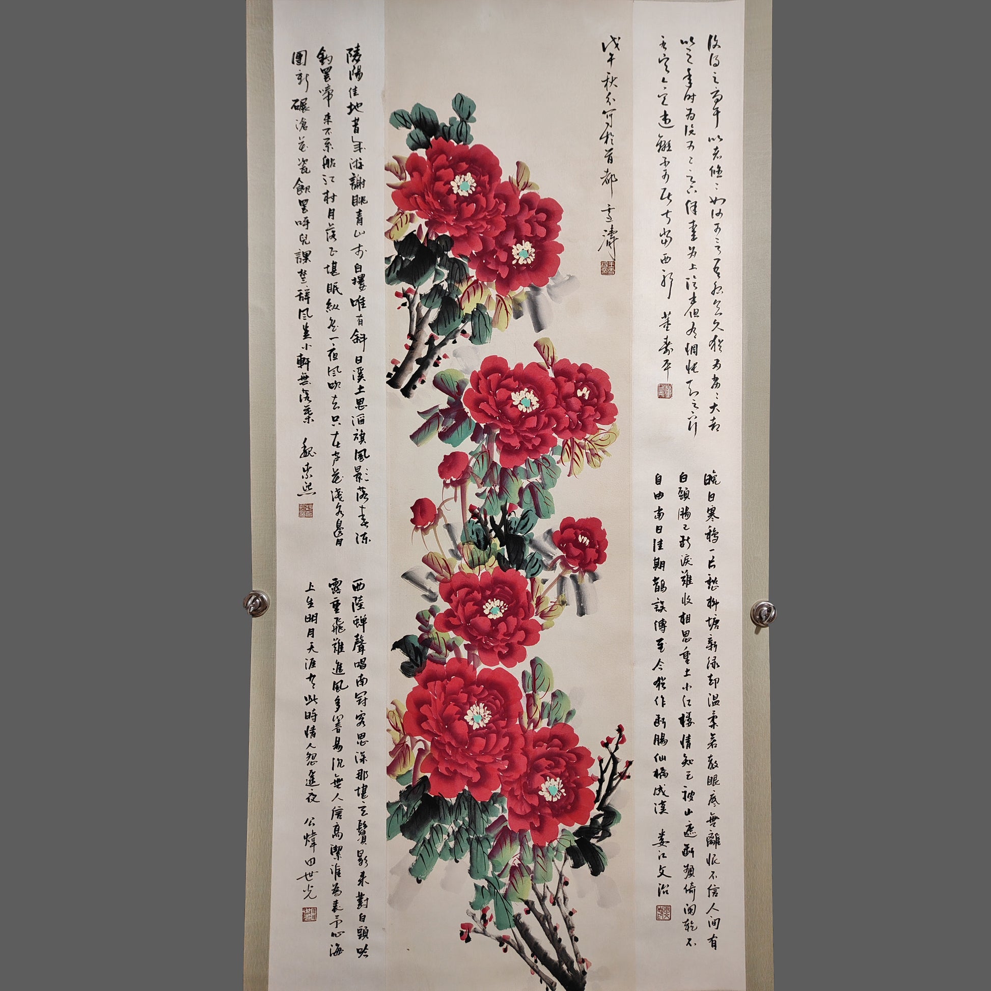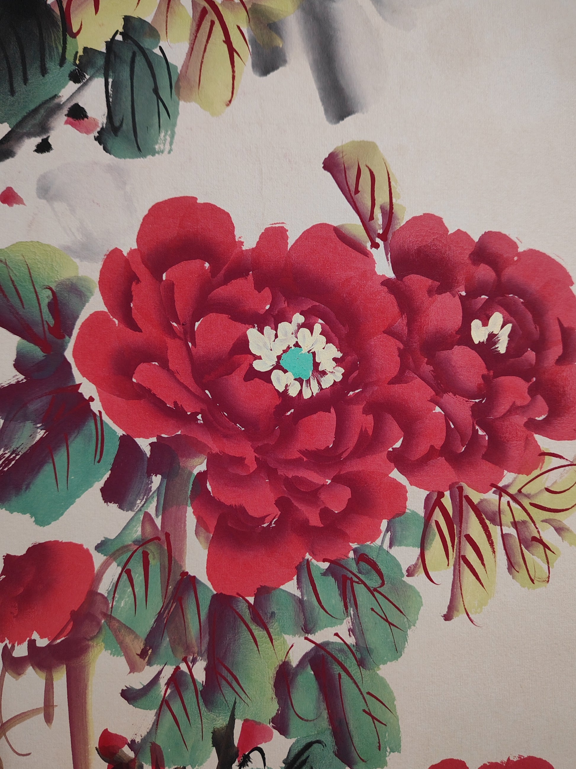 此中堂得雪濤「靈動敷色」之妙韻,處處融惲南田清麗與海派彩墨之精粹。 特選仿古宣經六礬五染古法處理,色墨鮮活若朝露沁芳,沒骨點染暗合《富貴長春圖》「水潤法」之玄機。 臨摹達「北平研習級」標準,較尋常牡丹更見近代小寫意清新氣韻,非止形似追求,實乃重現民國京津畫壇雅逸之風的鑒藏精品,當世難得的雪濤範本。